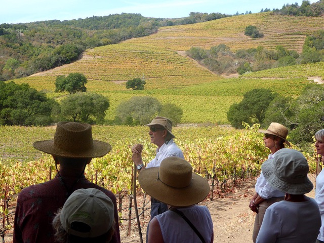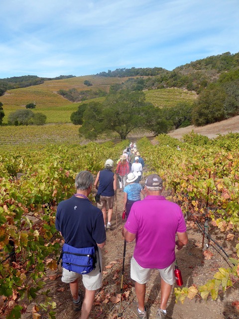 Haywood Winery hosted a very successful Sonoma Overlook Trail fundraiser last Sunday, September 27th. Fall was in the air, the leaves were turning yellow and a kingfisher flew overhead. Thirty four Overlook Trail donors walked the beautiful terraces of vines that are carved into steeply sloping hillsides. The ambitious amongst us reached the 800 foot elevation, while the less ambitious of us sat by the lake enjoying the peace and quiet and reflected colors of the fall leaves. Although the grapes had already been harvested, there were still a few left …. mmmm tasty …the Haywood’s don’t spray for insects and are happy to leave some for the birds…and walkers!