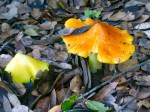 The rainy season is of course also the season of fungus, which thrives on damp conditions. The rains we have experienced the last few months has only spurred these interesting organisms to new bursts of growth. Just the other day, I was delighted to come upon a large patch of bright orange and yellow fungi (see picture of only two of dozens in one area) that had recently pushed up past the detritus of dead leaves and decomposed vegetation that comprise the forest duff.