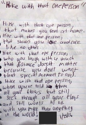 Here is the entry that I personally appreciated the most under the “advice” heading. Entitled “Hike with that one person,” I think it really speaks to what love is really about. Enjoy.