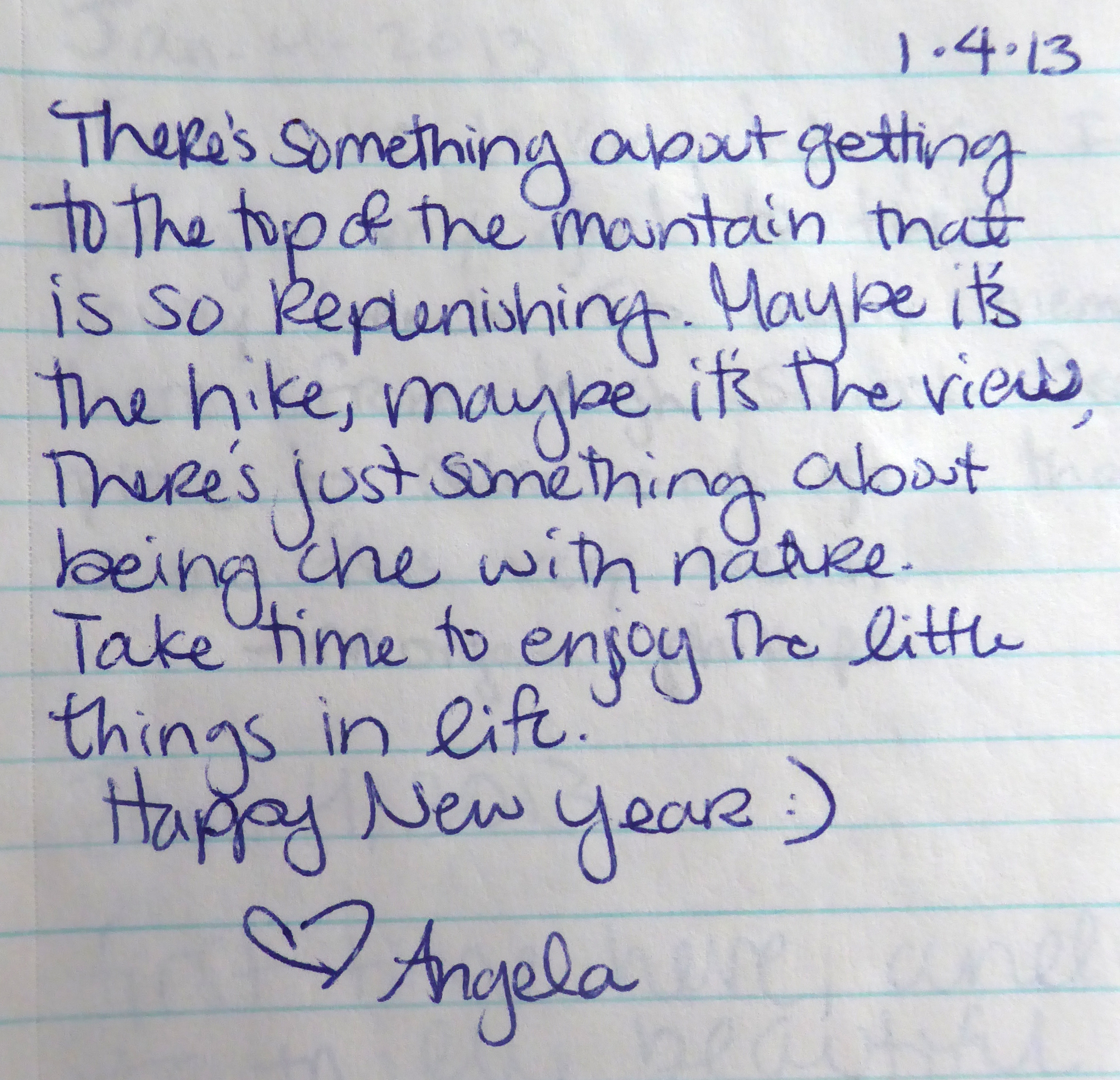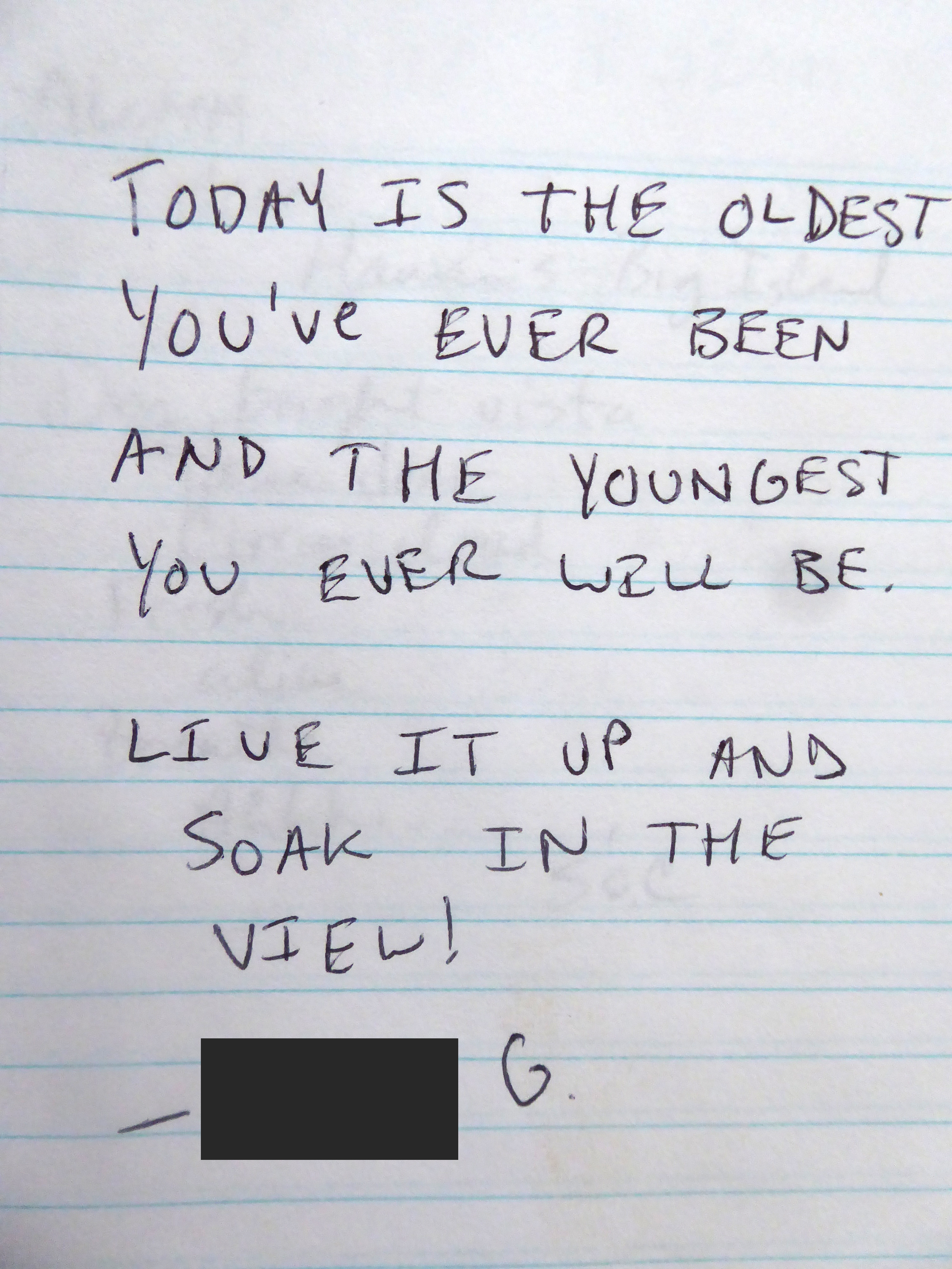On a more cynical note comes this entry from what I can only surmise is a disgruntled young person who was dragged up the trail by her or his parents. But I can’t help but be impressed with the proffered advice, especially “If U reach the top you get $5,000.” I’m so down with that, as I’d be a millionaire several times over by now.