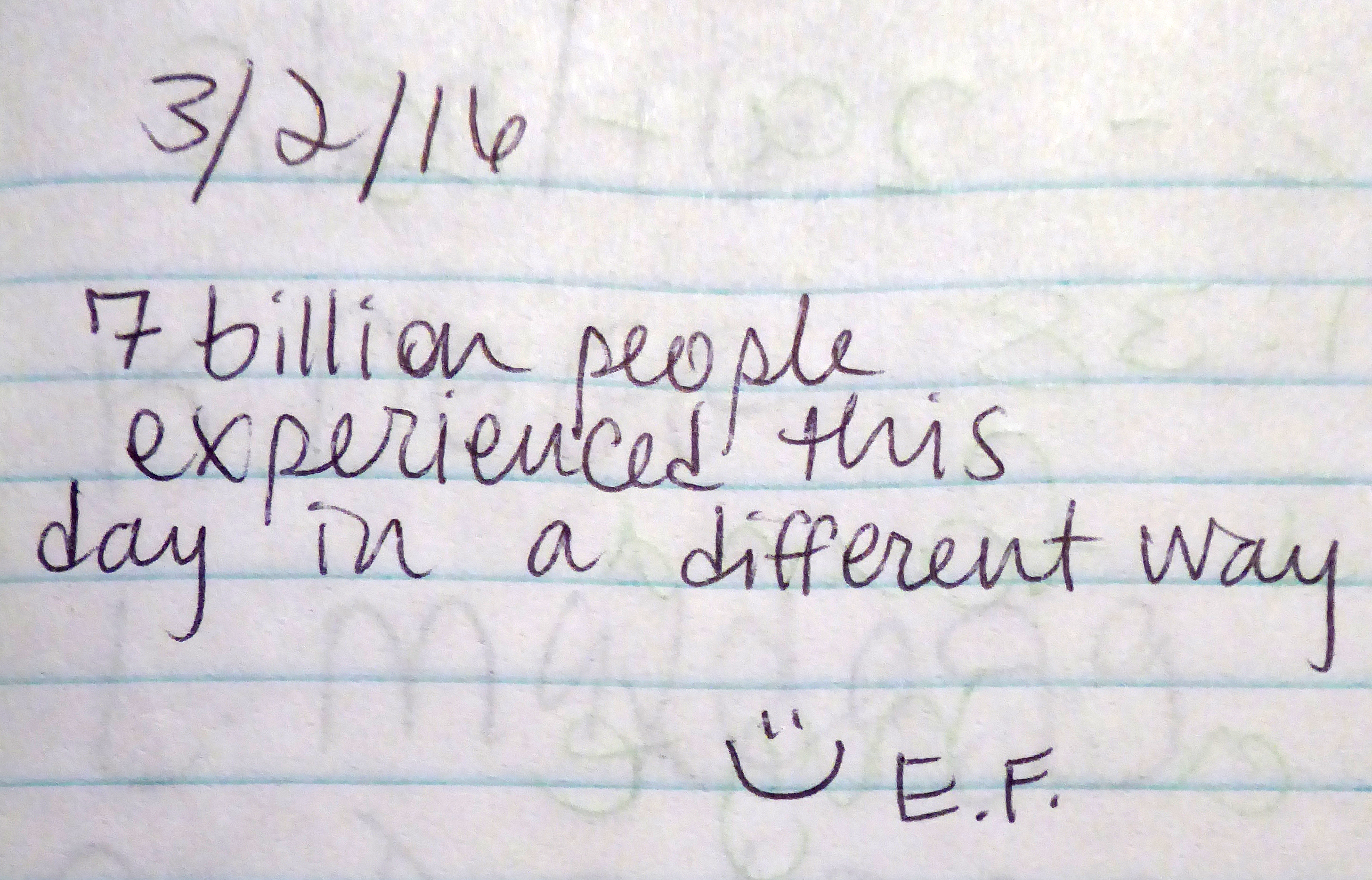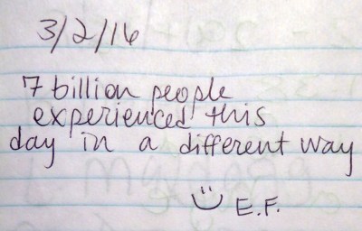 This first entry is brief and to the point, but it makes you think: “7 billion people experienced this day in a different way.” I often think about this when I travel — especially when it is a country that is vastly different than the United States. As I experience their very different reality it makes me think that on any single day as I go about my day where I live, these people in this other country have a very different experience of that day. Of course our hiker is pointing out that we ALL experience our day differently, even in the same household. And he or she is true, we do. Something to think about, and especially what effect it may have on how everyone ends up viewing the world.