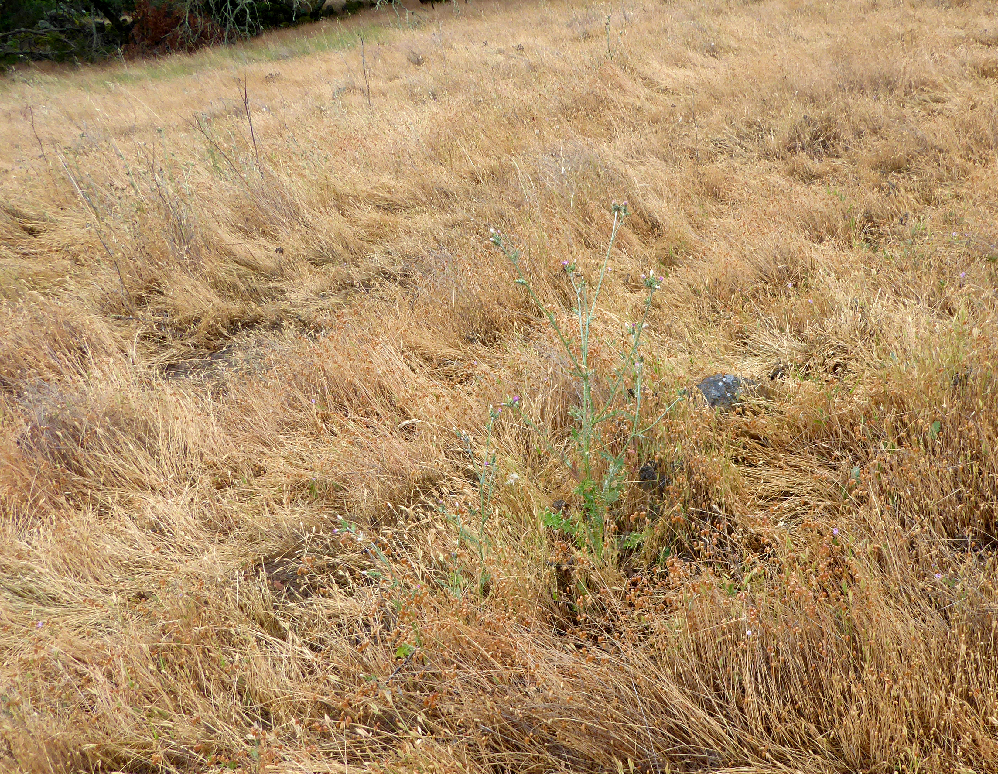 So today I went off-trail up into the hills. At the very upper edge I came to a patch that I started pulling. At first it seemed rather small, but as I pulled it kept going and going until I realized I would have to come back to finish it. I moved on, following the fence line. I came to another small patch of maybe a couple-dozen plants, then walked another ten feet of so and found another. Then another. And another. I soon came to realize that the hillside was essentially covered with it, but in small, lightly covered patches.