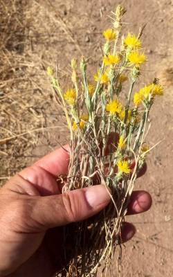 Long about now, I get a little frenzied, as I know that the “thistle season” is drawing to a close. To be specific, as we slouch toward August, our chance to pull invasive thistle begins to wane, as it begins to go to seed and pulling can lead to seed dispersal, which we definitely don’t want. By now the Italian thistle has long since dried out, making it a dubious target, although potentially still fair game if you’re careful. But by this time our focus has shifted to the Yellow Star thistle (YST), which is blooming, and will continue into August. And there is still plenty to get, although on the main part of both the Overlook and Montini properties we are looking pretty good.