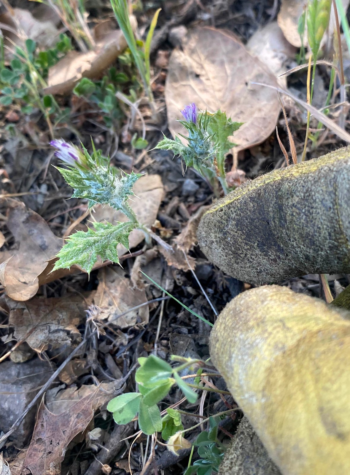 These are truly tiny plants (see picture), which barely clear the soil and go directly to bloom, which of course makes them hard to see, challenging to pull, and frustratingly difficult to eradicate. This is part of what makes Italian thistle the hardest invasive species I’ve yet battled — far harder than Yellow Star thistle, which is all but eradicated except along Norrbom Road.