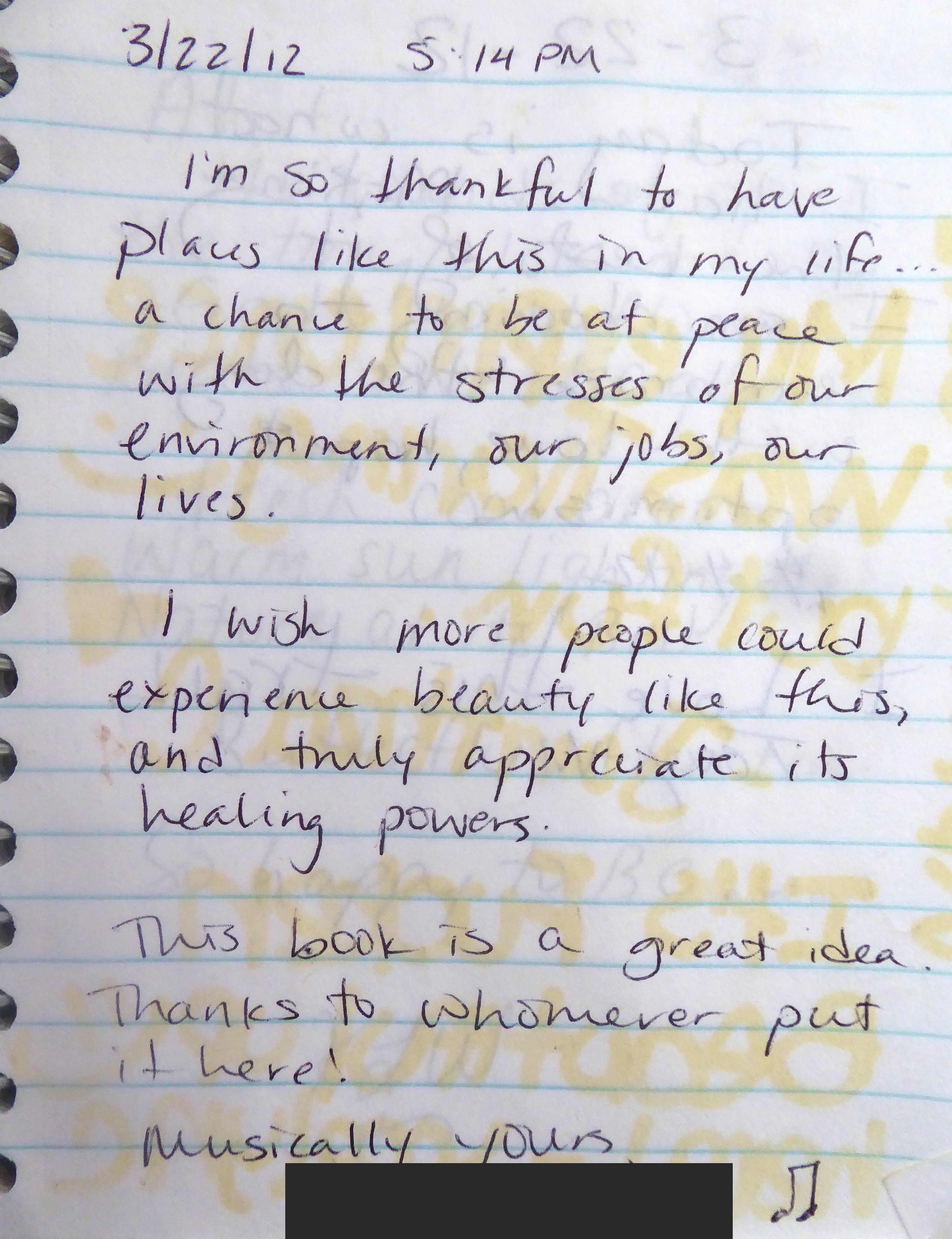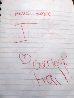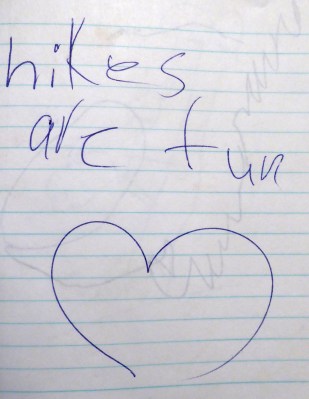 This final entry I imagine comes from a young person, whom I also imagine is coming to learn that being out in nature can be a great way to spend some time. “Hikes are fun,” it reads, with a big drawn heart. You know, we think so too, so we’re glad that you’ve discovered a love of hiking, which will be your friend throughout your lifetime.
