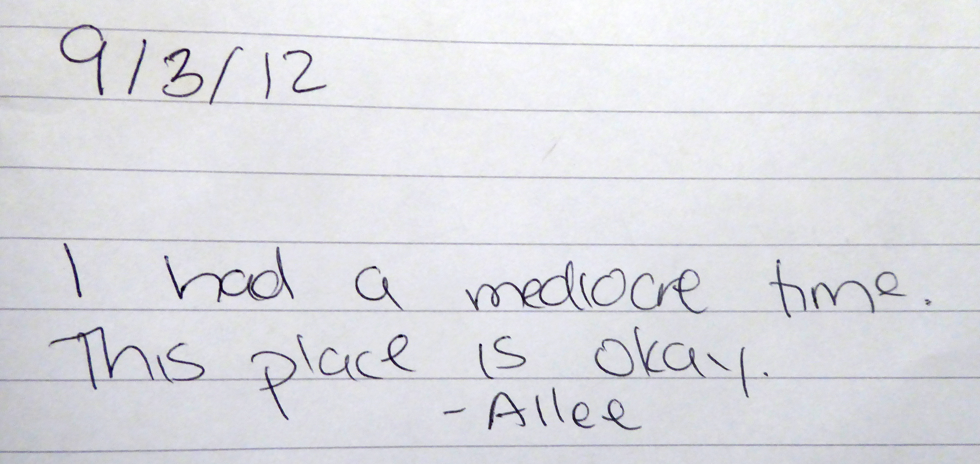 Next I want to highlight two very brief entries. This first one is so droll that I can’t figure out if it is serious or not. I like to think of it as being just plain funny. But even if it’s completely serious, I still think it’s funny. “I had a mediocre time,” it begins, and yet ends with “This place is okay,” signed, “Allee”. Yeah, Allee, it’s pretty darn OK. Glad you think so too.