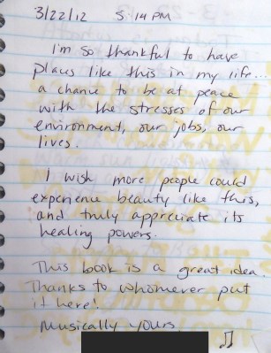 A much more thorough and nuanced entry is our next highlight. The author expresses a lot of thoughts that many of us feel, and that bring many of us back, day after day. “I’m so thankful to have places like this in my life,” he or she writes, as if reading my mind, “a chance to be at peace with the stresses of our environment, our jobs, our lives.” Yes, so that.
