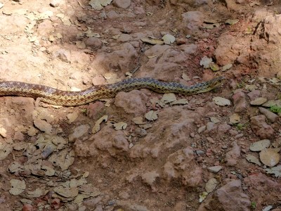 I saw a gopher snake the other day, draped right across the trail enjoying the sun. I took some pictures (see one to the right) and walked around it, leaving it undisturbed. I then told other hikers to look for it, secretly hoping it was still on the trail so they could see it. Seeing snakes on the trail is actually a rare occurrence, and should be viewed as an excellent opportunity to see a type of wildlife that one doesn’t see very often.