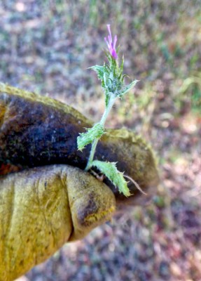 At this point in the Italian thistle season, some of it is beginning to go to seed and you also start to see a particular phenomenon — tiny plants that are going straight to flower. It’s like they know that they only have a short window in which to go to seed before conditions become too dry, so they pop up and go to flower immediately. Of course we can’t ignore these, as their seeds have as much reseeding potential as seeds from a large plant, they just might not travel as far.