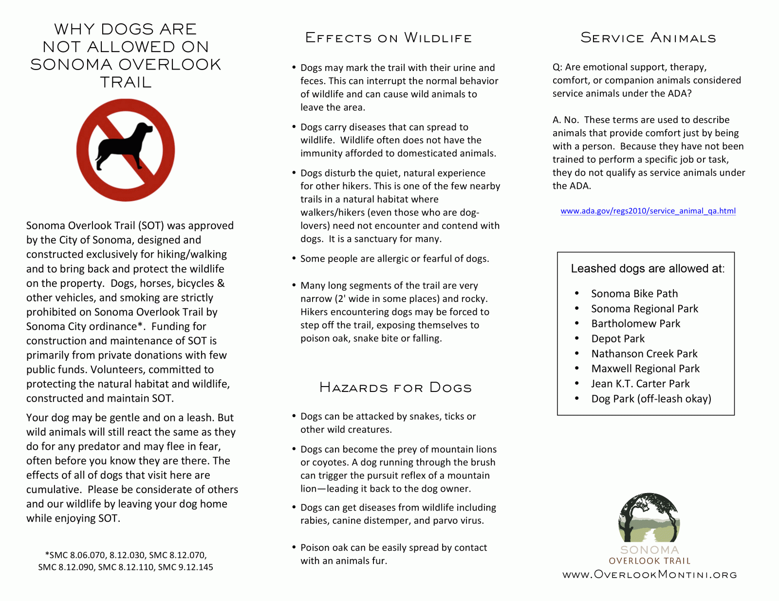 Dogs are not allowed on the Sonoma Overlook Trail or Montini Preserve at any time. Signs are posted at all trailheads, and a brochure, available for download and at the kiosk, includes places in Sonoma Valley where you can bring your dog. To report dog violations, contact Animal Control at the Sonoma Valley Police Dept: (707) 996-3602, or (707) 996-3601 on weekends.